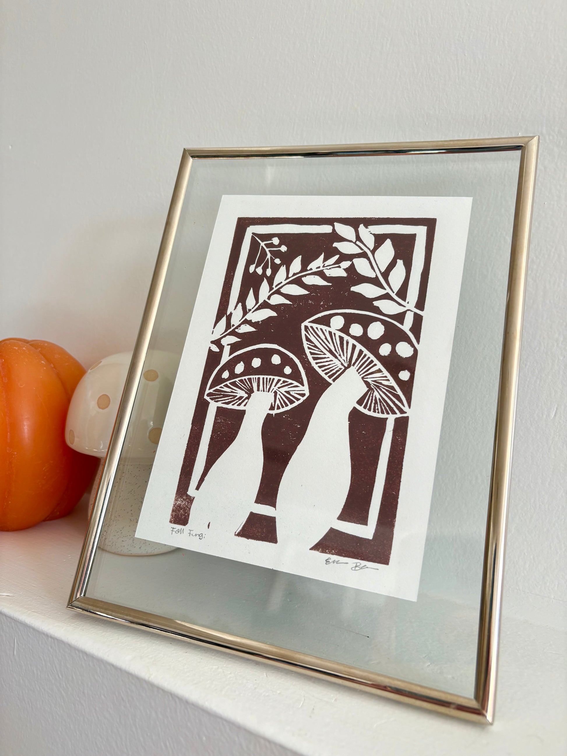 This hand-carved linocut was based on an original drawing inspired by chilly walks in the woods, and printed by hand using a baren to transfer ink from the linocut block to the page.