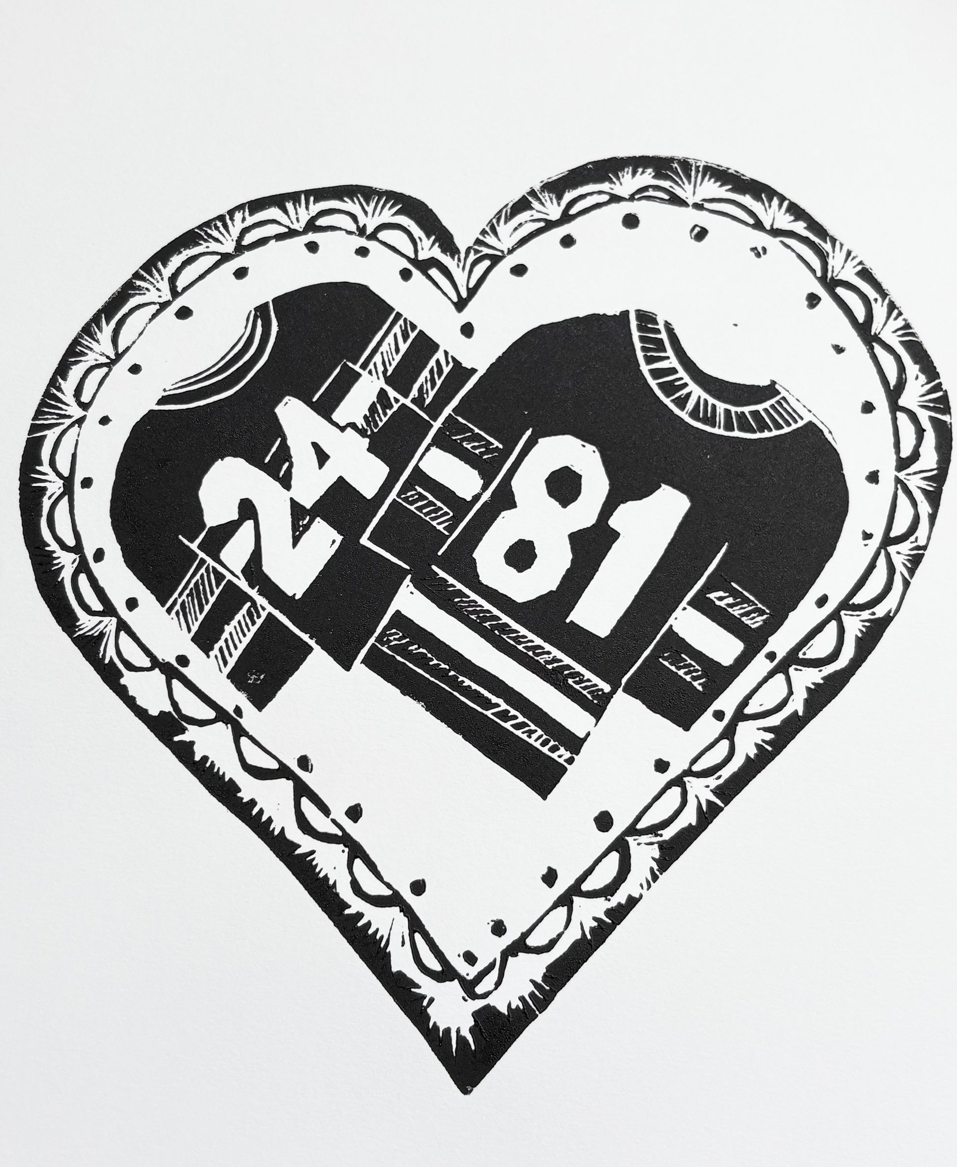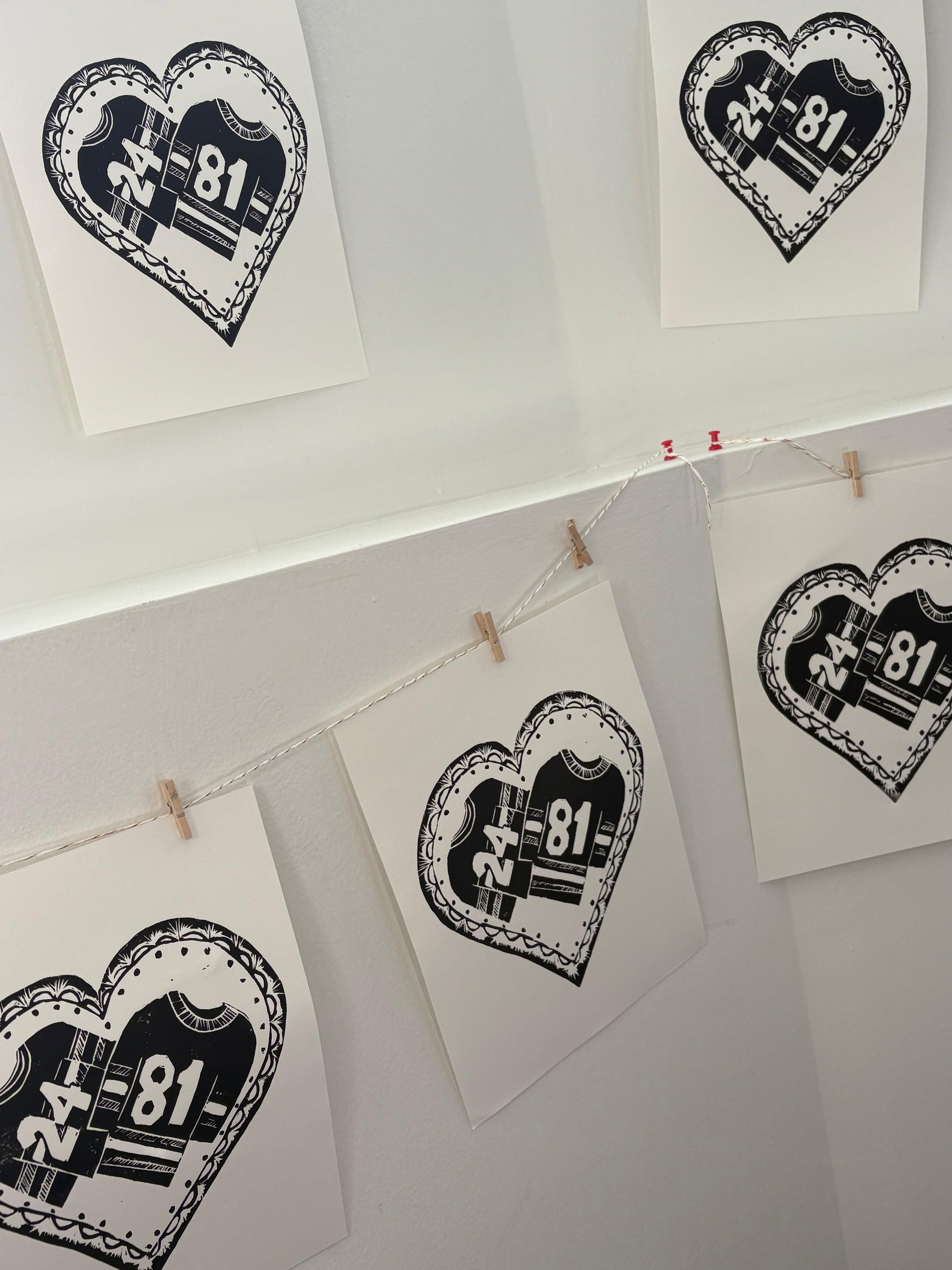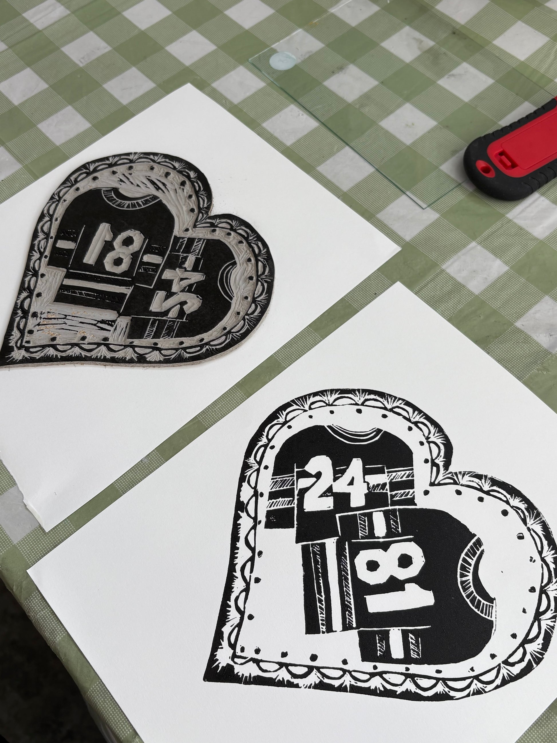 This hand-carved linocut was based on an original drawing inspired by the love story in Heated Rivalry and printed by hand using a baren to transfer ink from the linocut block to the page.